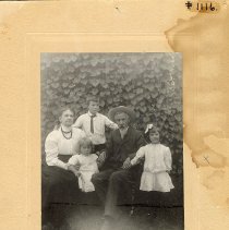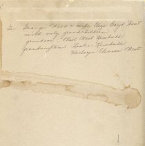 Cabinet card portrait of George and Eliza West posing outside with their three grandchildren. Below image in front is handwritten, "General Geo. WEst - Mrs. West and grandchildren." On back is handwritten in ink: "Gen. George WEst & wife Eliza Boyd West with only grandchildren. Grandson: Neil West Kimball. Granddaughters: Leslie Kimball, Harleyn Eleanor West." |