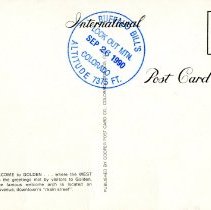Color postcard of Washington Avenue in Golden, Colorado showing the "Welcome to Golden" arch. The arch has the words "Where the West Remains" on the bottom portion of the sign. In the middle of the sign is a large painting of a miner panning in a creek with a couple of cows on the left side. At the top of the painting is a clock. Stamped on the back of the postcard: Buffalo Bill's, Lookout Mtn., Sep 26 1990, Colorado, Altitude 7375 FT. |